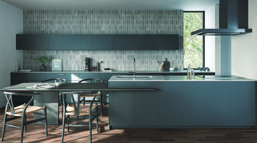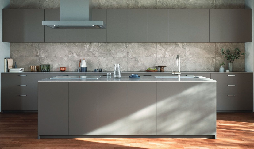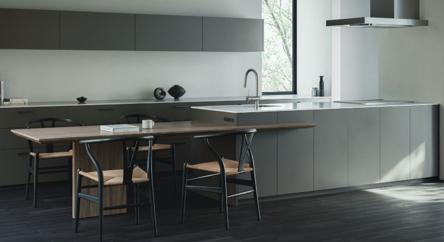 混合樹種をイメージしたキッチン。扉に「モルタルグレー」を合わせ、古今かきと重厚感がバランスよく調和します。