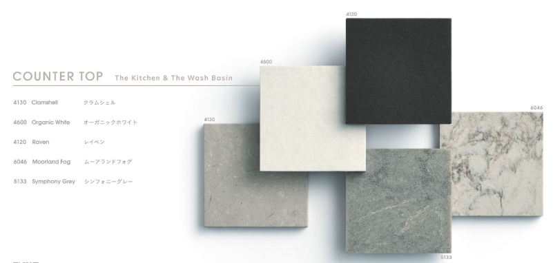 • 意匠性と清掃性の両立: デザイン性の高さはもちろんのこと、水や汚れが染み込みにくく、清掃性にも優れた機能性抜群の素材です。