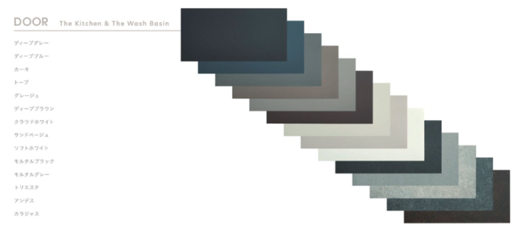 ディープグレー、ディープブルー、カーキ、トープ、グレージュ、ディープブラウン、クラウドホワイト、サンドベージュ、ソフトホワイト、モルタルブラック、モルタルグレー、トリュフ、アンデス、カラジャスなど。