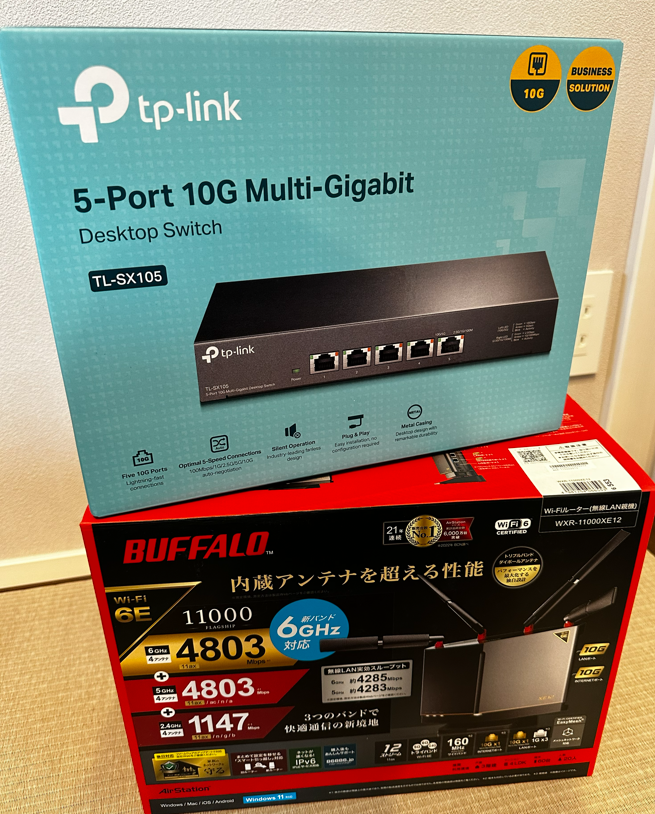 | Wi-Fi親機 | Buffalo WXR11000XE12 | Wi-Fi 6E対応。10Gbps WAN対応で高速回線を活かせる |