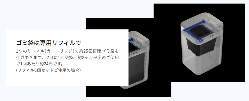 TOWNEWの袋は「リフィル」と呼ばれる専用カートリッジ式です。1リフィルで約25回分の袋交換が可能ですが、1リフィルあたり約1,500〜2,000円と一般的なゴミ袋と比べるとコストは高めです。