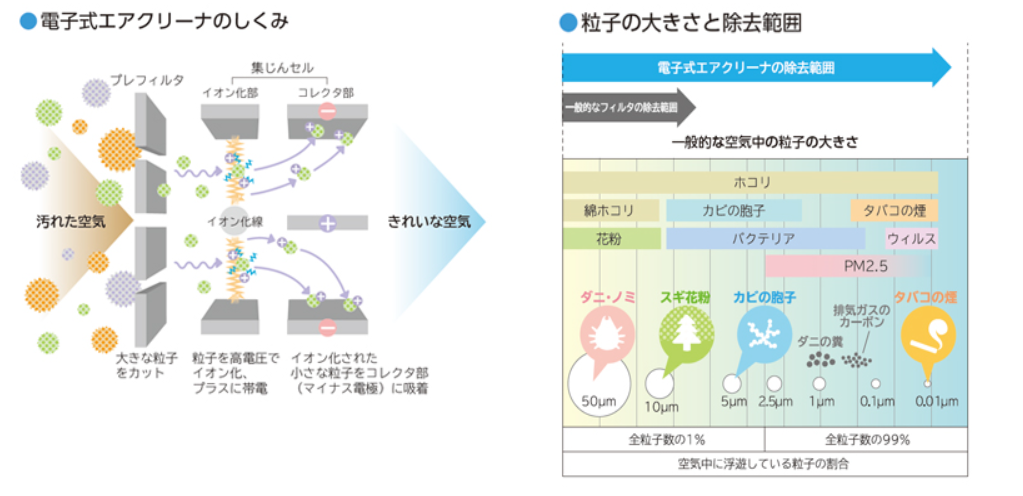 - 電子式エアクリーナで0.1〜2.5μmの微粒子を99%除去