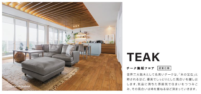 住友林業を象徴する樹種のひとつ。チークは経年変化で飴色に深まり、住むほどに美しくなるのが最大の魅力です。耐久性・耐水性にも優れており、船舶のデッキにも使われるほど。住友林業のモデルハウスでもチーク床を採用している展示場が多く、実際に見て触れることができます。