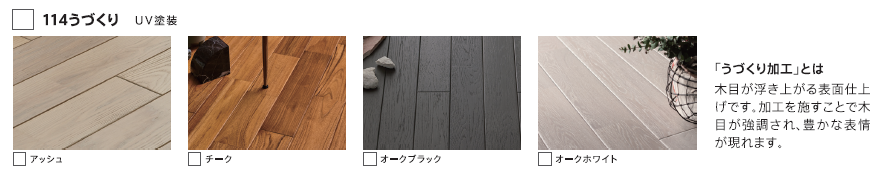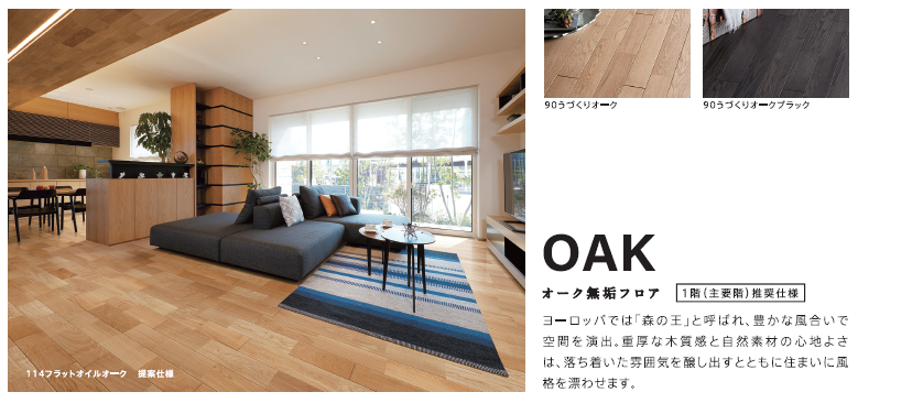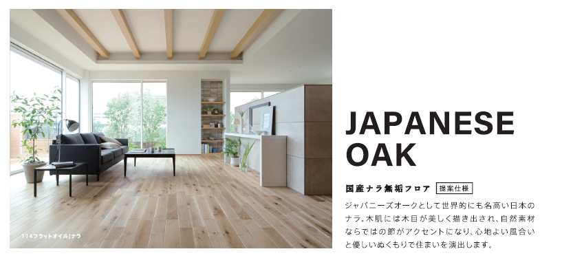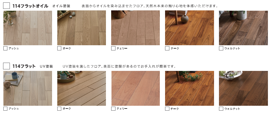 商品ラインナップは「2Pフラット/2Pラスティック For DOG(UV塗装)」「114フラットオイル(オイル仕上げ)」「114フラット(UV塗装)」「114うづくり(UV塗装)」の4タイプ。対応樹種はアッシュ・オーク・チェリー・チーク・ウォルナット・オークブラック・オークホワイトと豊富です。無垢の質感と安定性を両立した「いいとこ取り」の床材として、多くの施主に選ばれています。なお「うづくり加工」とは、木材の表面を丁寧に磨いて柔らかい部分を削り、木目を浮き上がらせる仕上げ方法で、素足で歩いたときの心地よさが格別です。