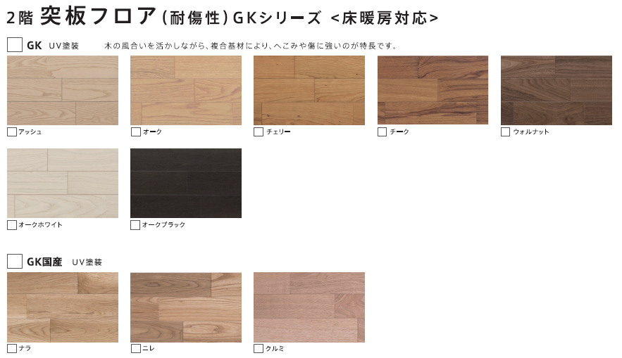 コストパフォーマンスに優れ、傷や汚れにも比較的強いのがメリット。住友林業では「GKシリーズ(UV塗装)」と「GK国産(UV塗装)」が用意されており、2階の標準床材として推奨されています。対応樹種はアッシュ・オーク・チェリー・オークホワイト・ナラ・オークブラック・クルミ・チーク・ウォルナットと、挽板以上に選択肢が豊富。床暖房にも対応しています。