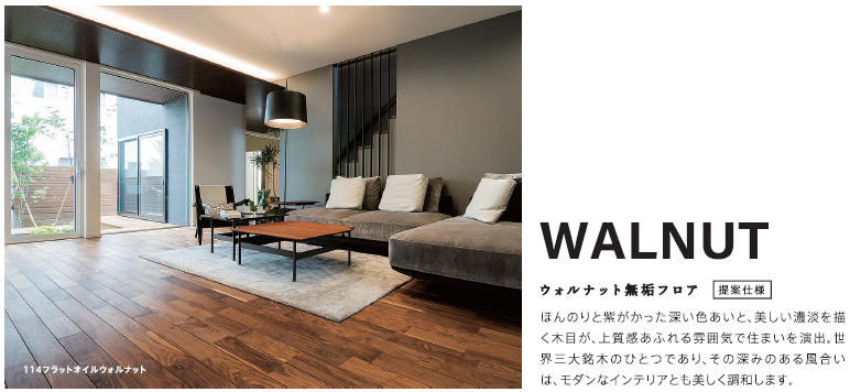 世界三大銘木のひとつで、深みのあるダークブラウンが特徴。モダンやホテルライクなインテリアとの相性が抜群です。住友林業の施主にも非常に人気が高く、リビングや玄関ホールに採用するケースが多く見られます。硬めの木質で傷がつきにくいのもメリットです。