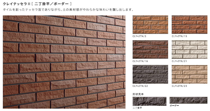 | Mix BB-A | 二丁掛平・ボーダー | 12mm | 2つの形状をミックス。レンガ調の温かみある外観 | 南欧風・レンガ調 |